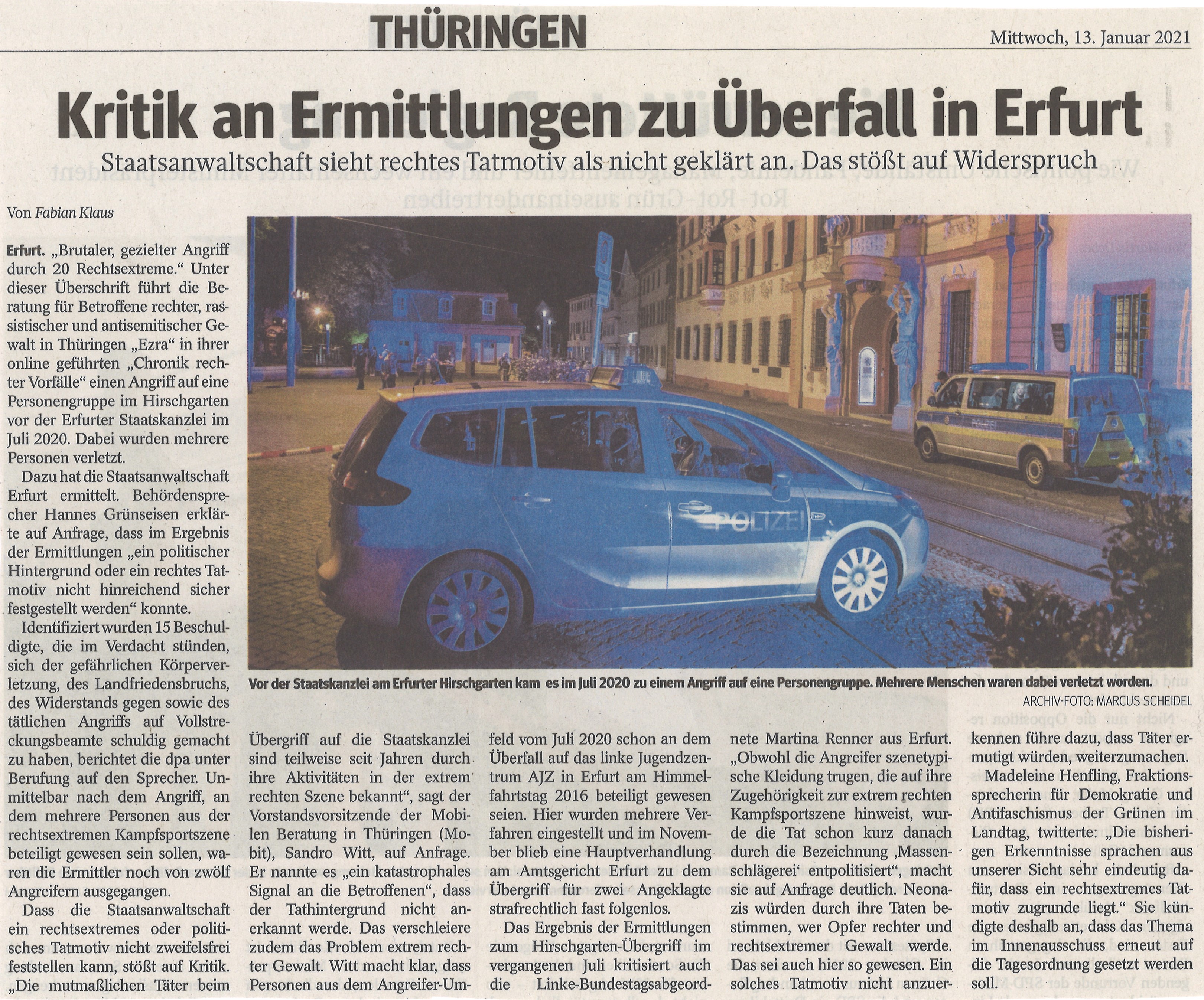 Bereits im Juni 2020 soll eine Personengruppe vor der Erfurter Staatskanzlei angegriffen worden sein. Die Angelegenheit hatte großes Aufsehen erregt, da die Personen aus der rechtsextremen Szene sein sollen.